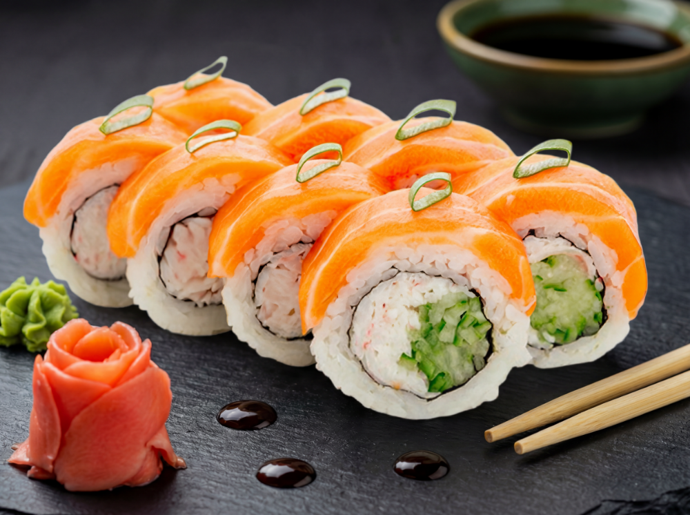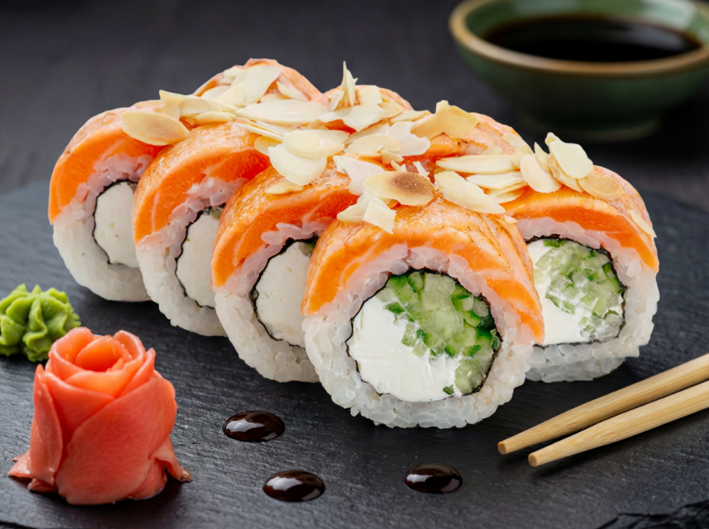Вершковий сир, огірок, обпалений лосось, пелюстки мигдалю, сироп «Солона карамель» (8 шт.)