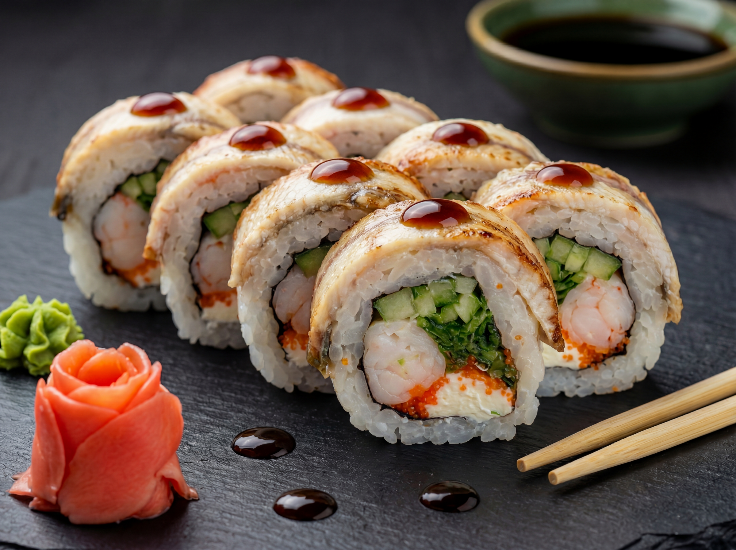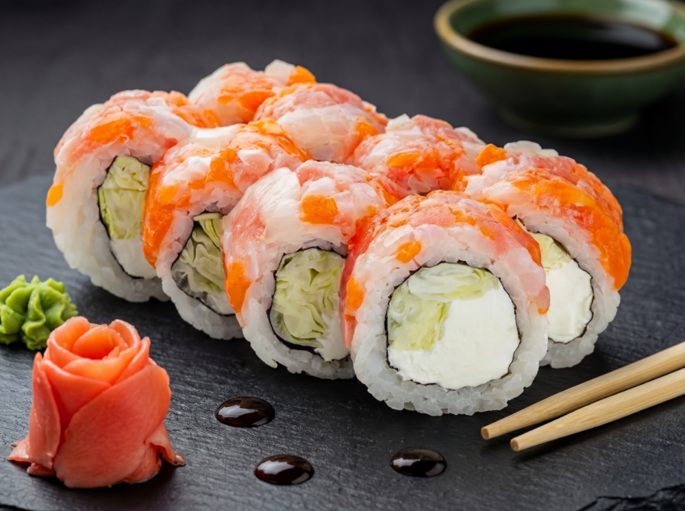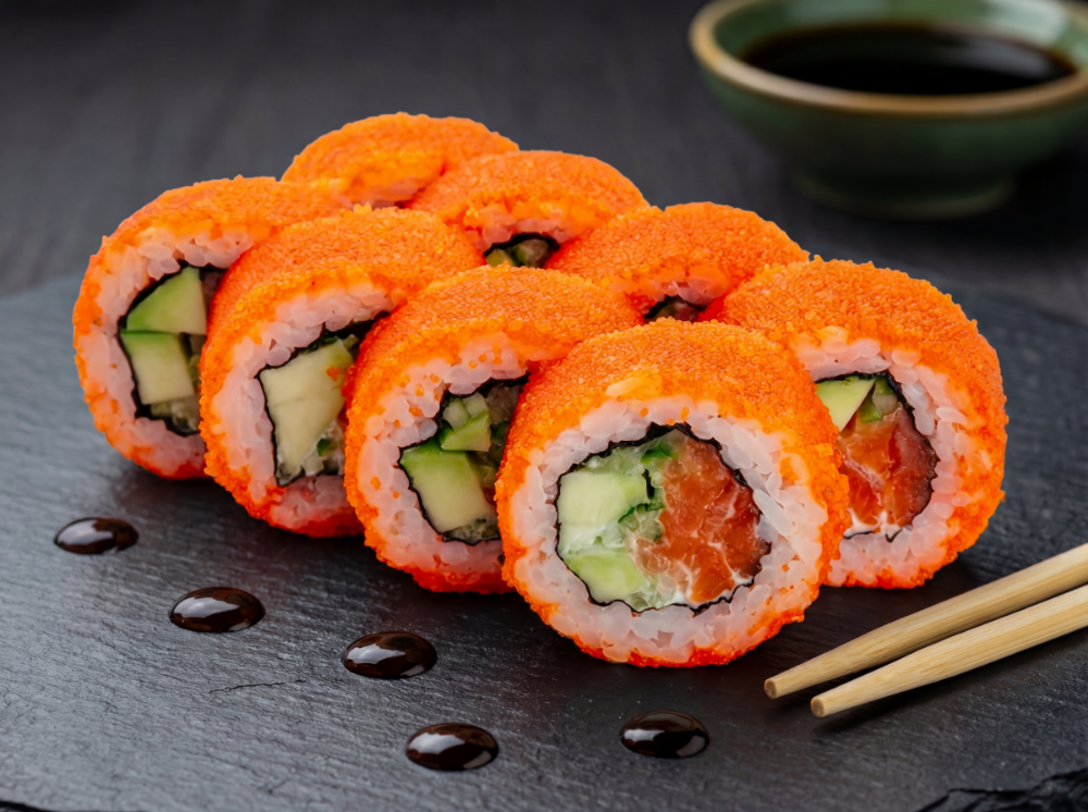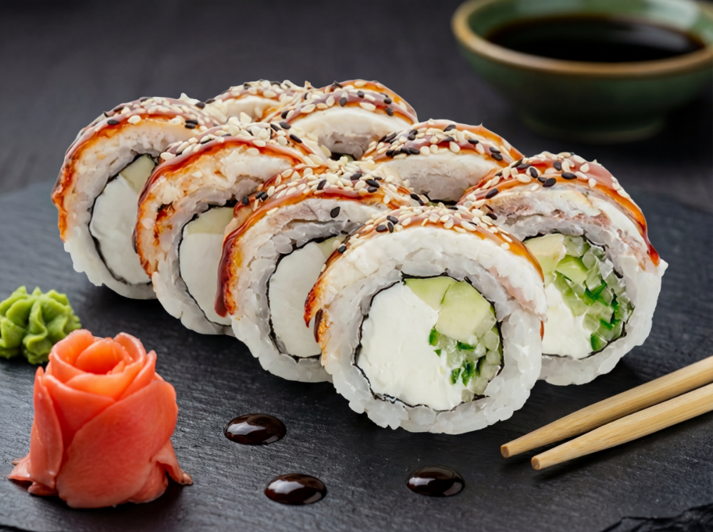 Крем сир, ікра тобіко, креветка, огірок, чука, угору, соус унаги, кунжут (8 шт.)