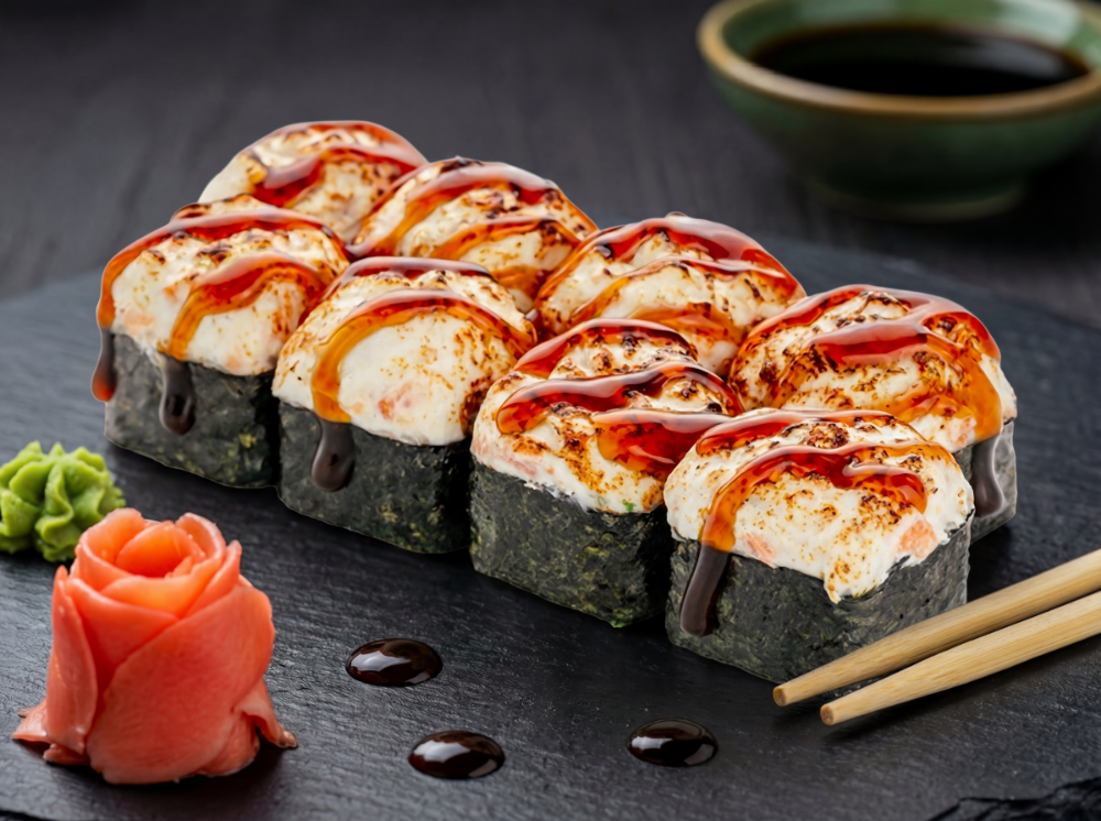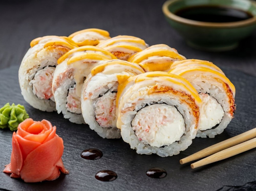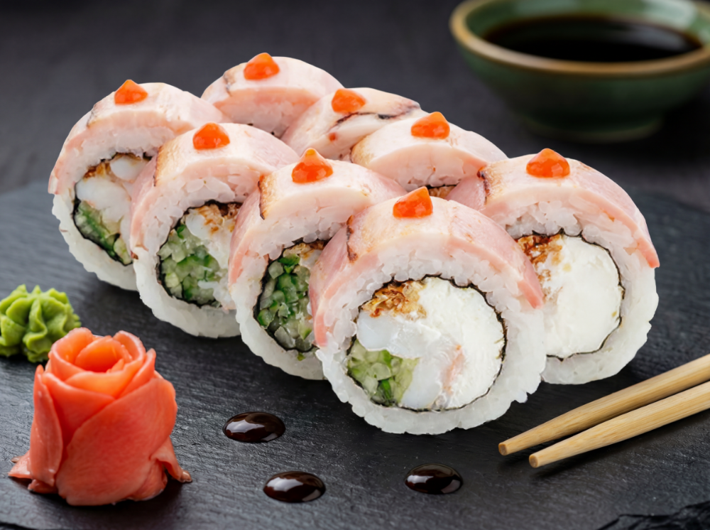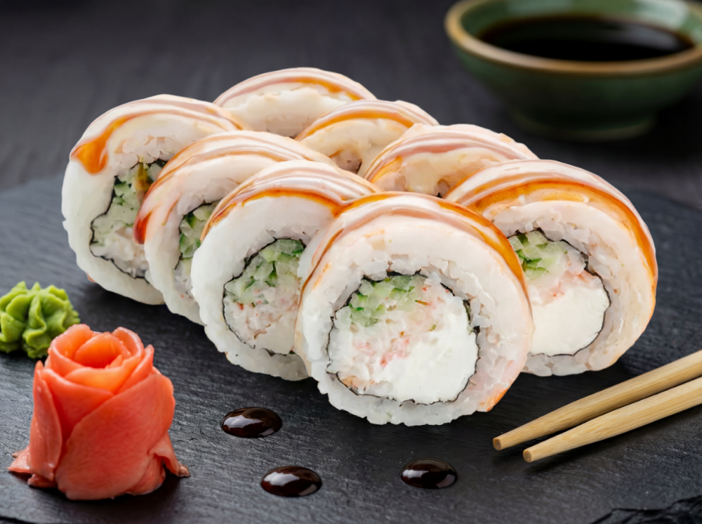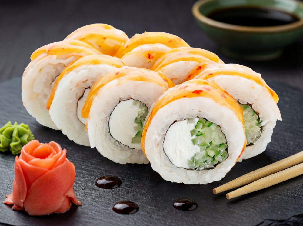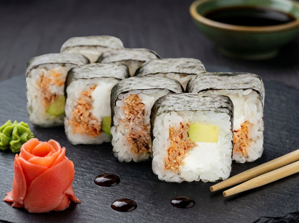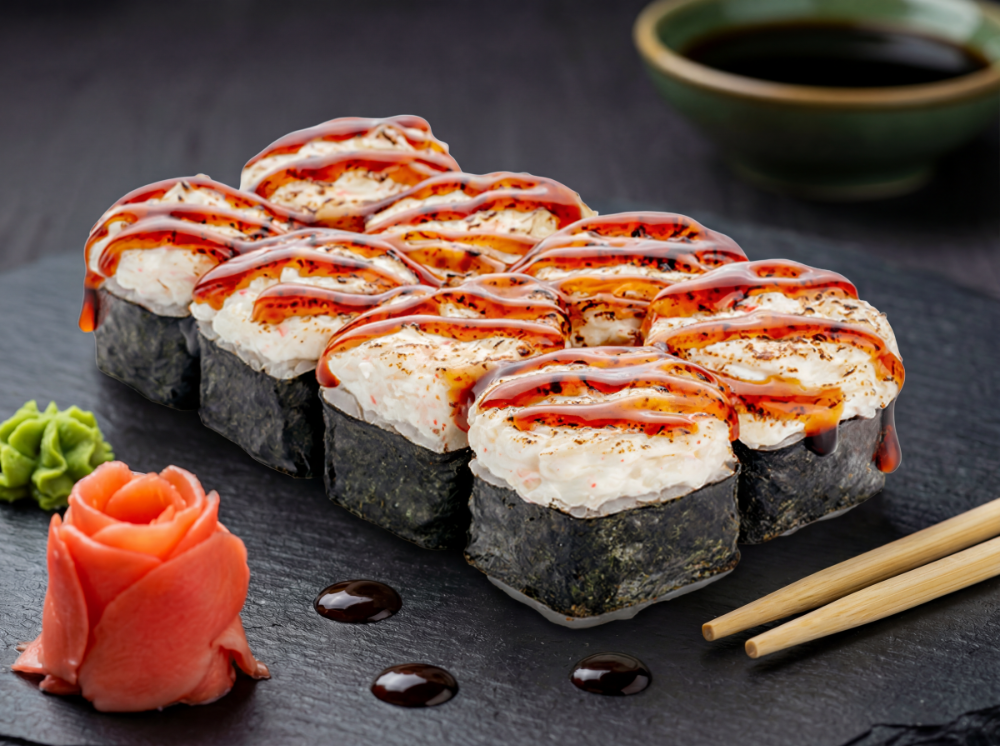 Рис, японський майонез, ікра тобіко, авокадо, тунець, креветка, лосось, сирна шапка, соус унагі, соус спайсі (8 шт.)