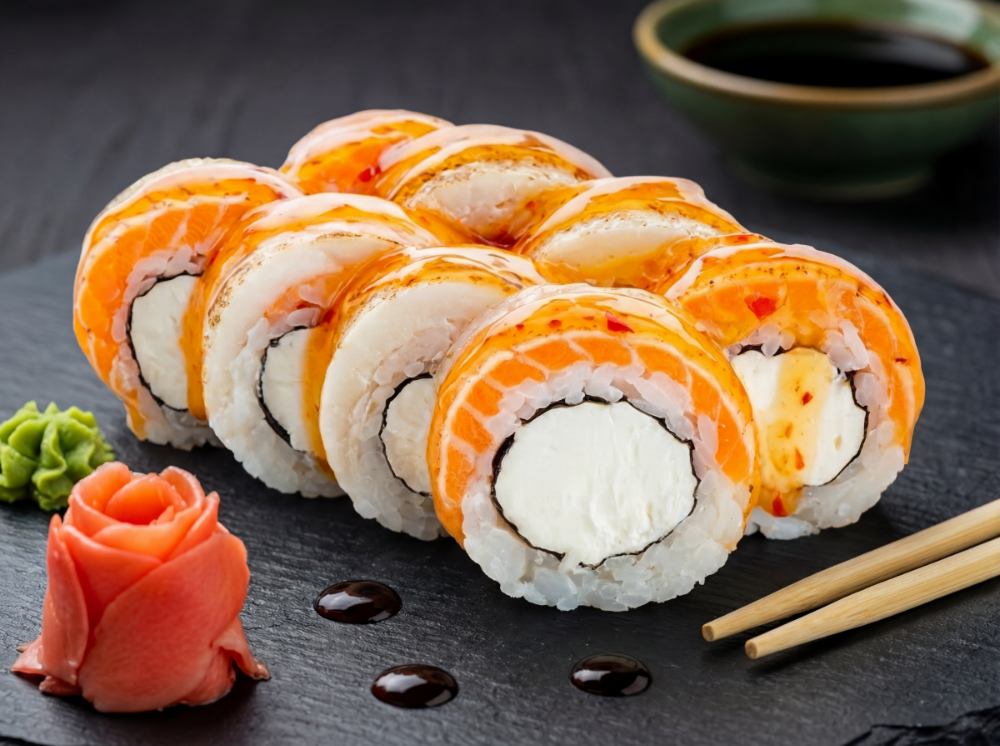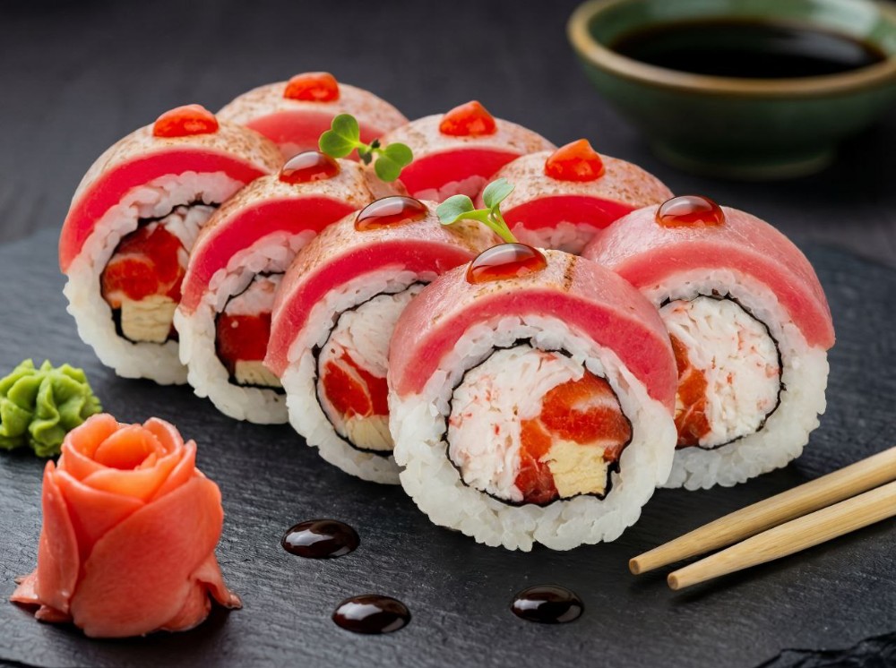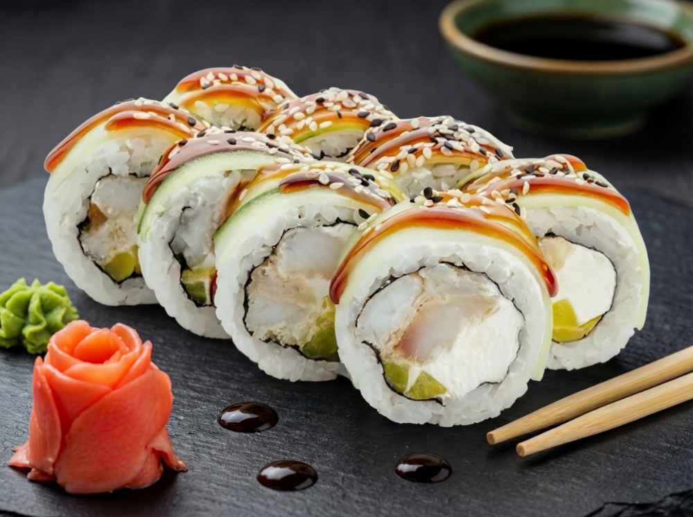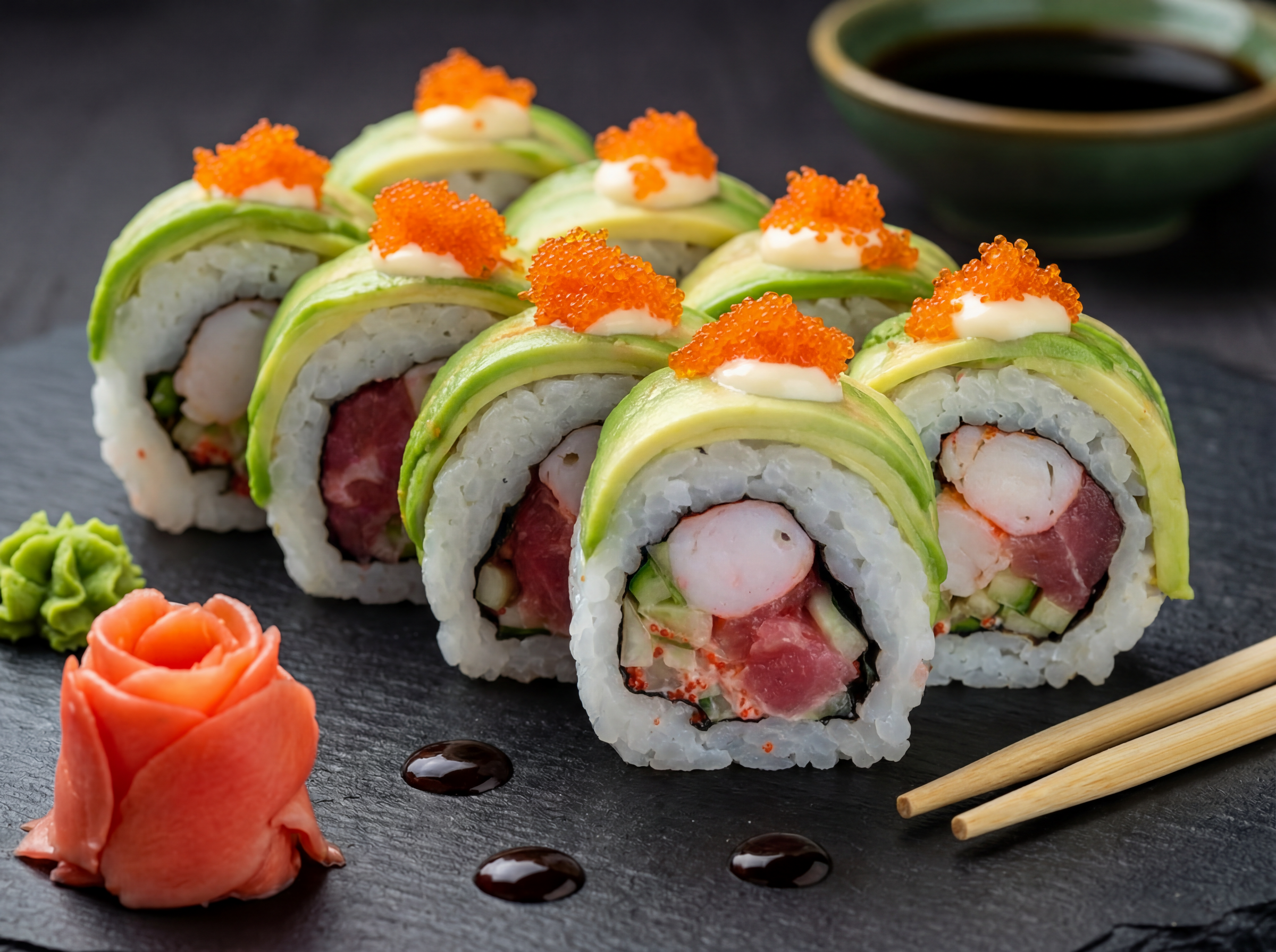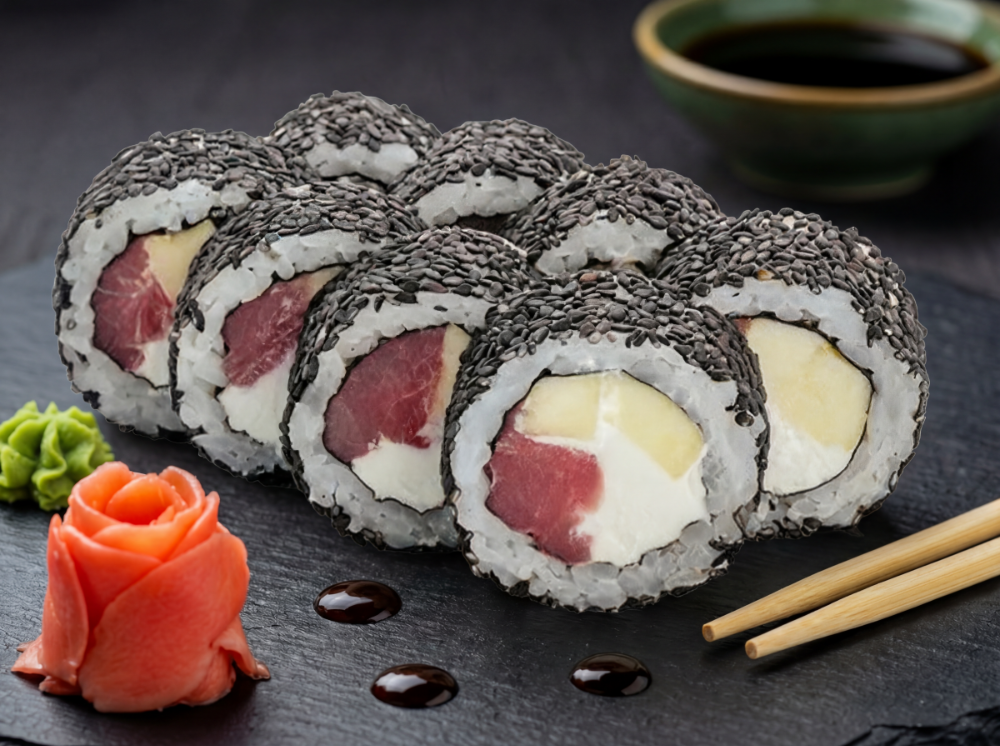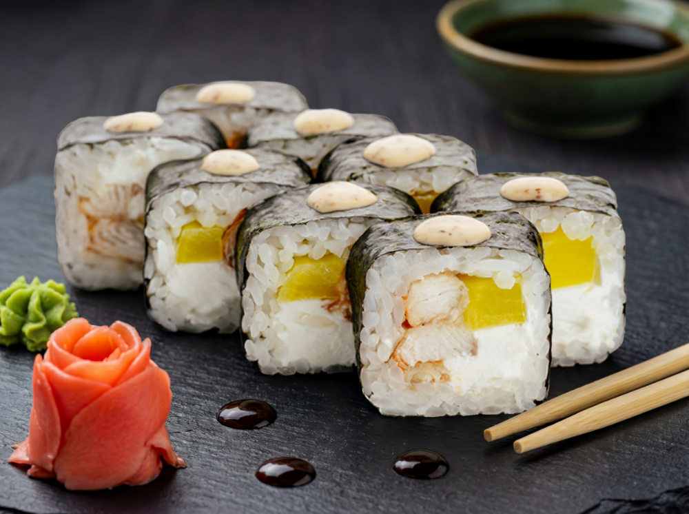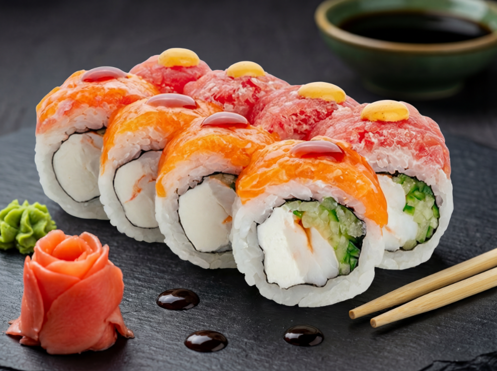 Рис, японський майонез, ікра тобіко, авокадо, тунець, креветка, лосось, сирна шапка, соус унагі, соус спайсі (8 шт.)