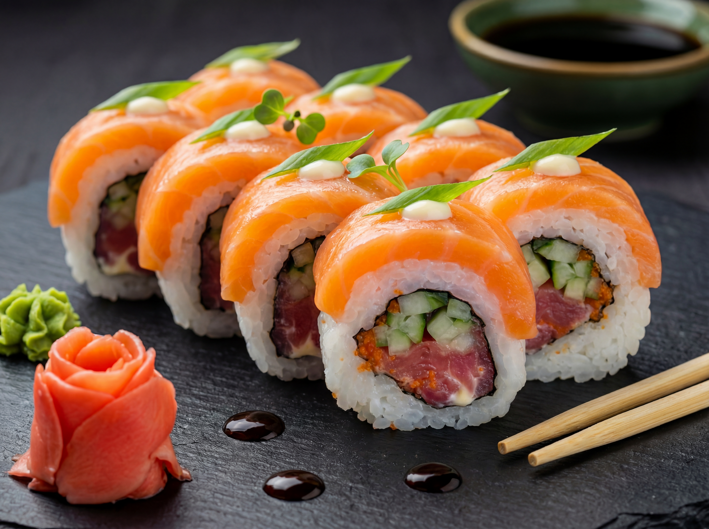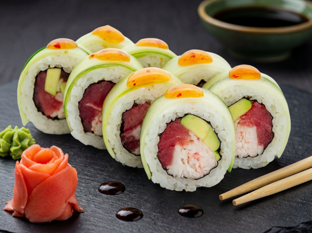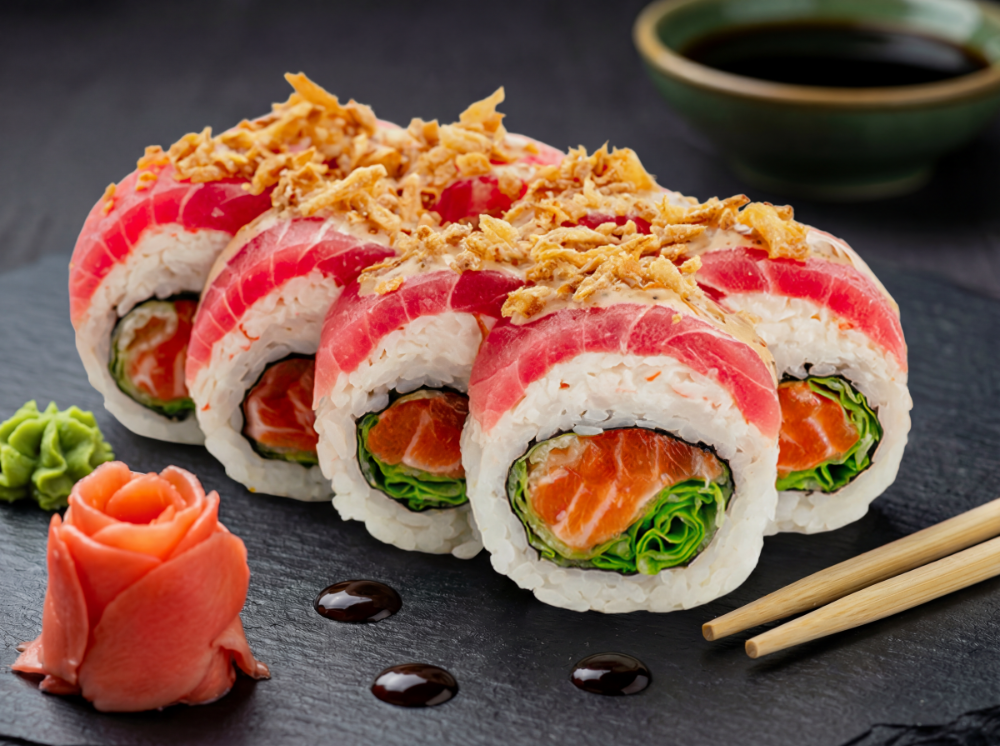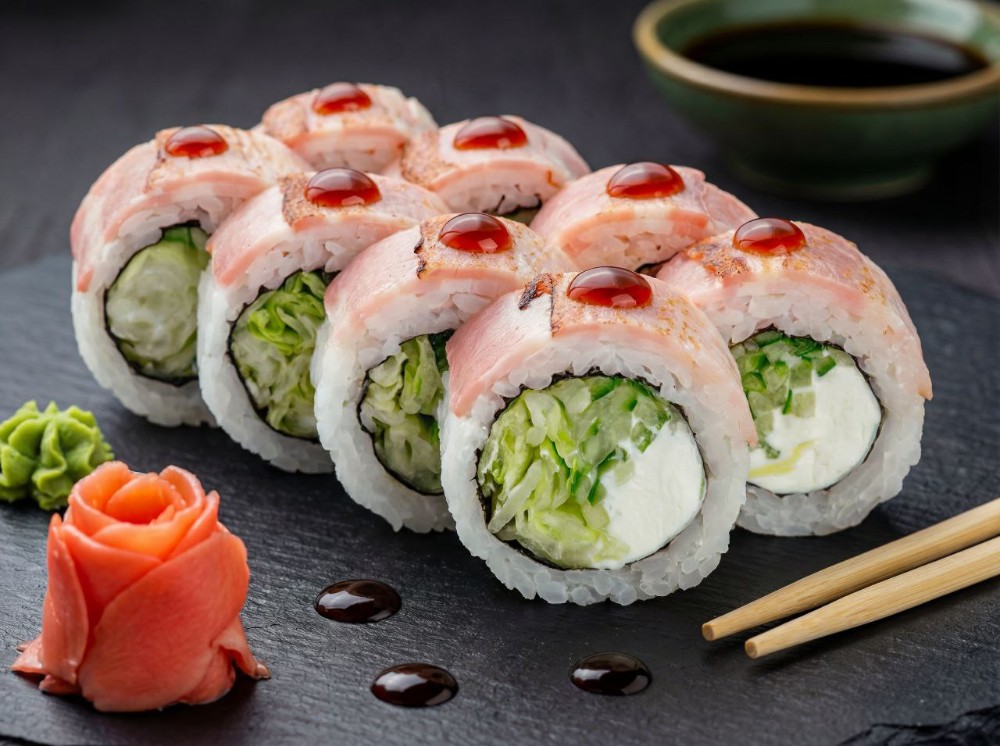 Японський майонез, ікра тобіко, огірок, тунець, лосось, зелений лук, соус унаги (8 шт.)