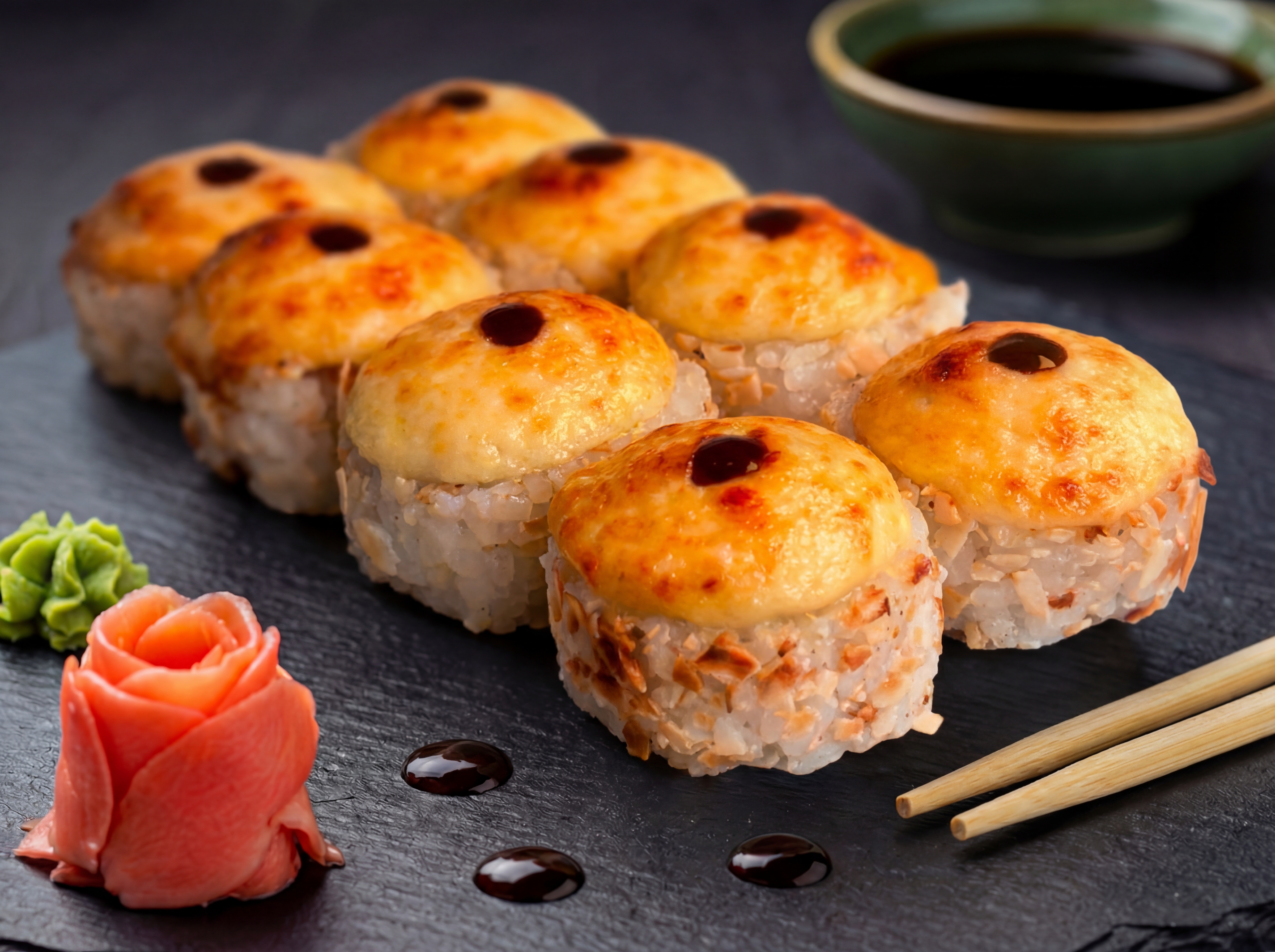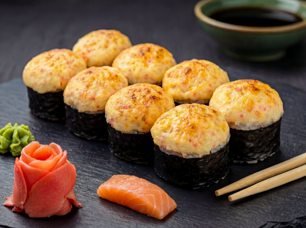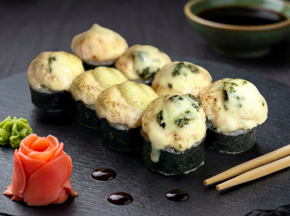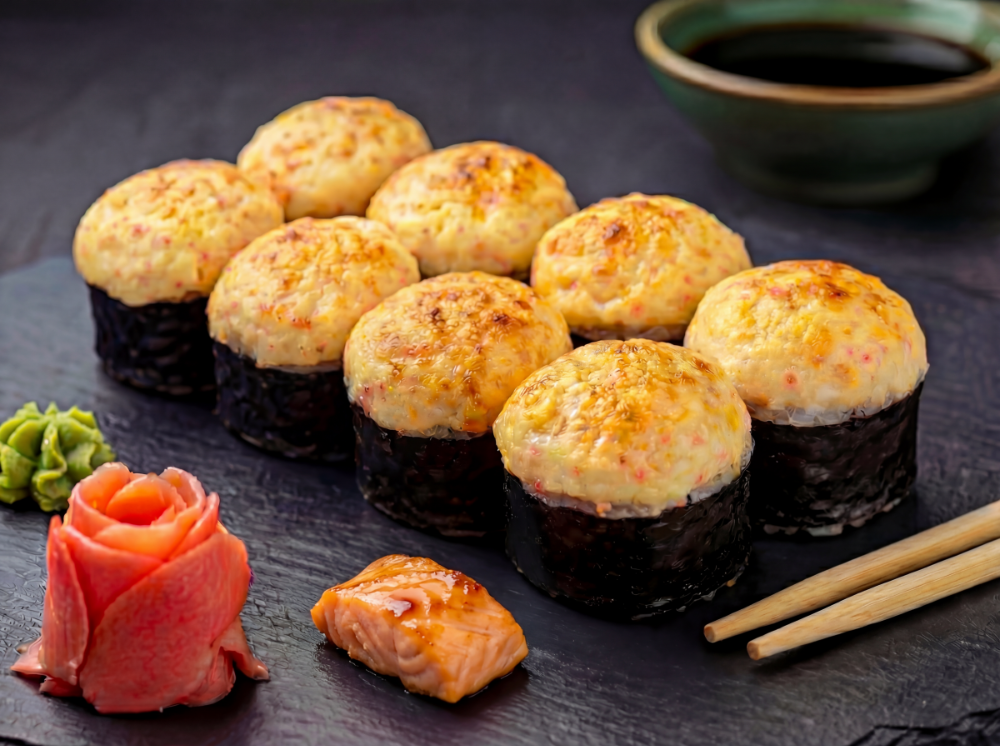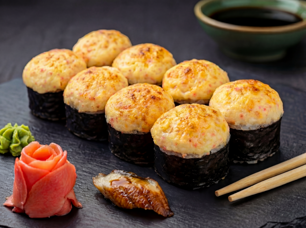 Рис, пластівці, сир чеддер, крем сир, авокадо, лосось, сирна шапка, соус унаги (8 шт.)
