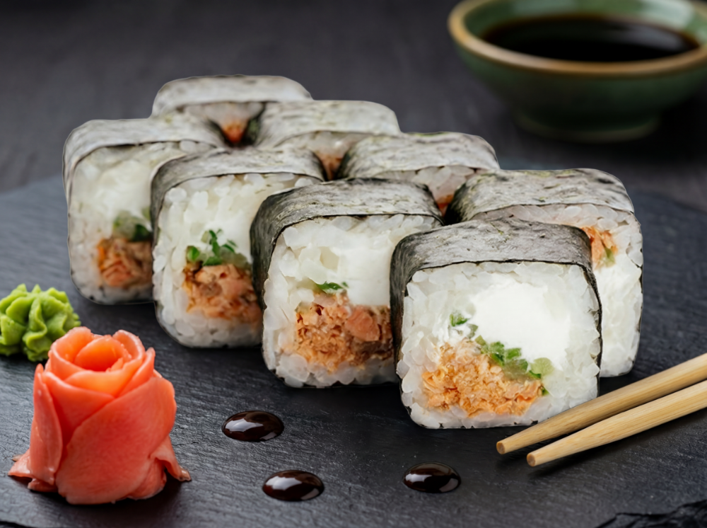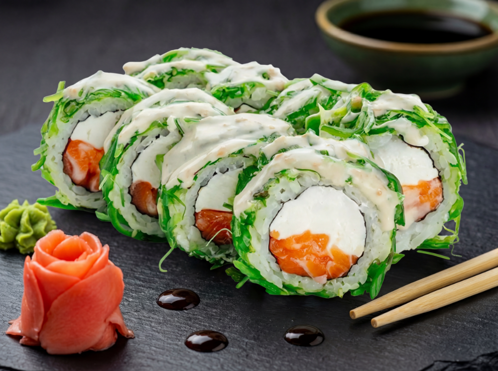 Сир вершковий, свіжий лосось, водорості вакамі, горіховий соус (8 шт.)