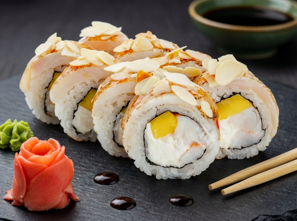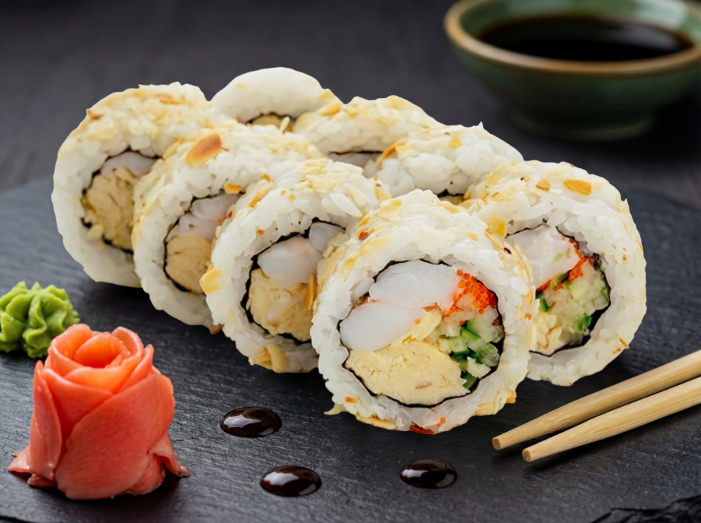 Креветка, японський омлет томаго, огірок, тобіко ікра, пластівці мигдалю (8 шт.)