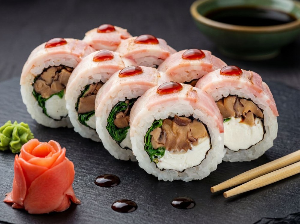 Рис, норі, гриб шийтаке, бекон, крем сир, цибуля зелена, соус унагі (8 шт.)