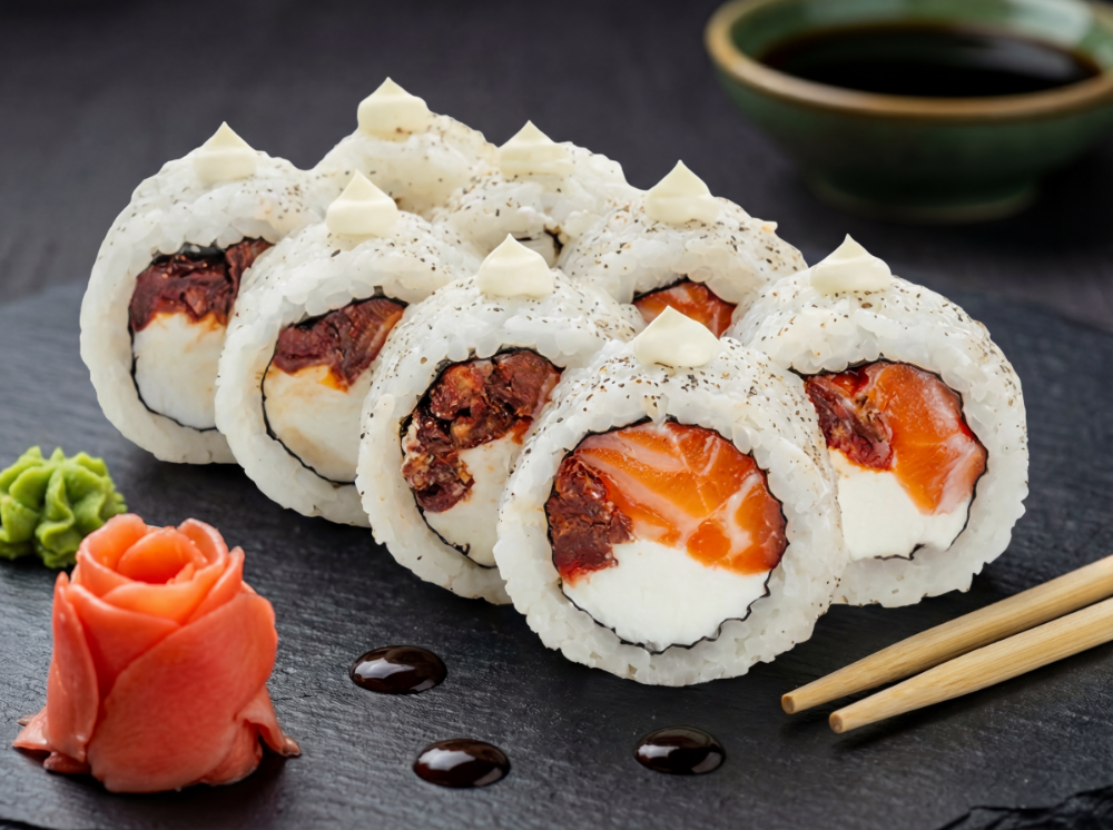 Сир вершковий, свіжий лосось, в'ялений томат, перець чорний мелений, японський майонез (8 шт.)