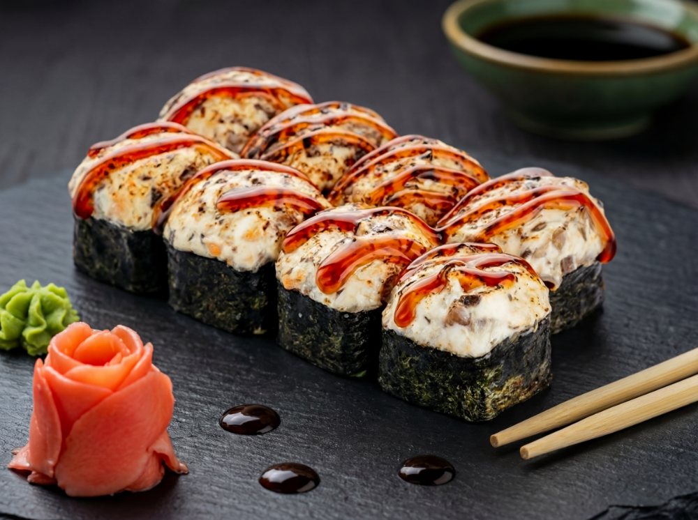 Рис, норі, філе вугра, такуан, сир вершковий, горіховий соус (8 шт.)