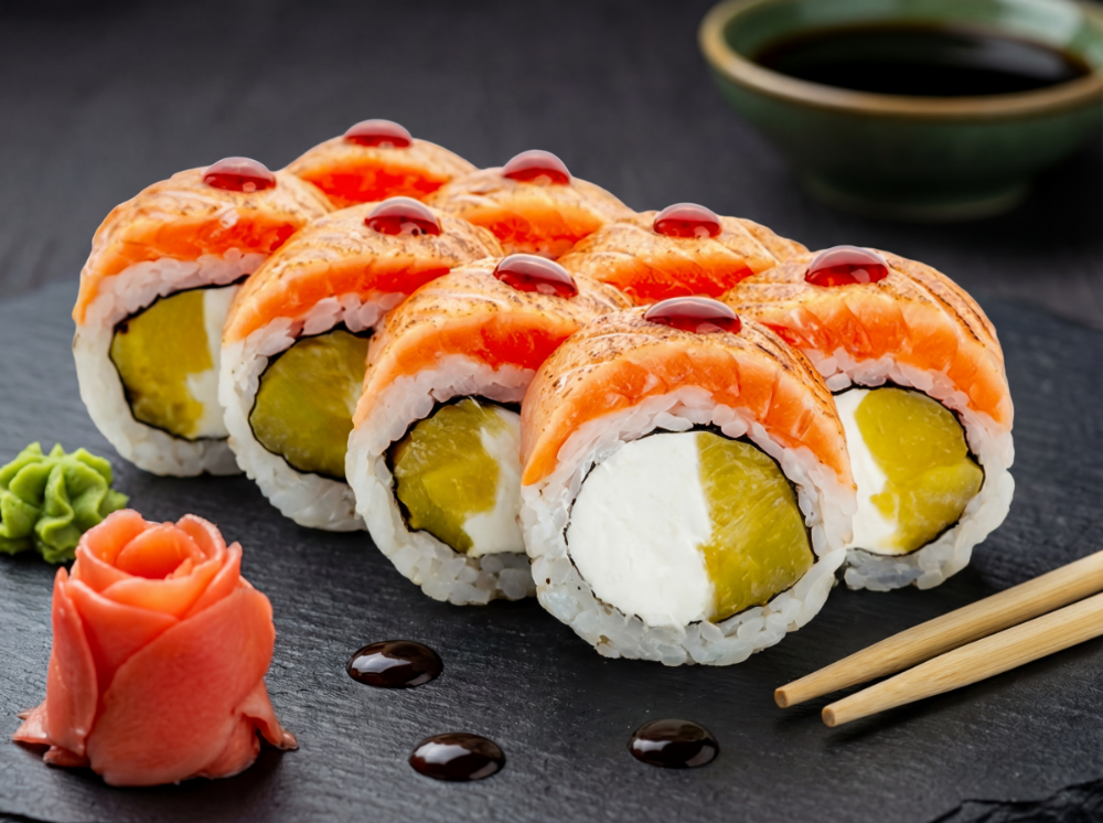 Рол в обпаленому лососі з персиком